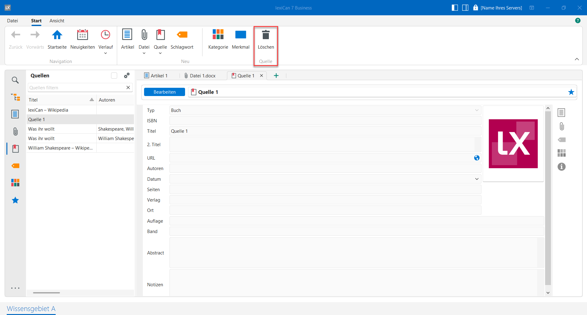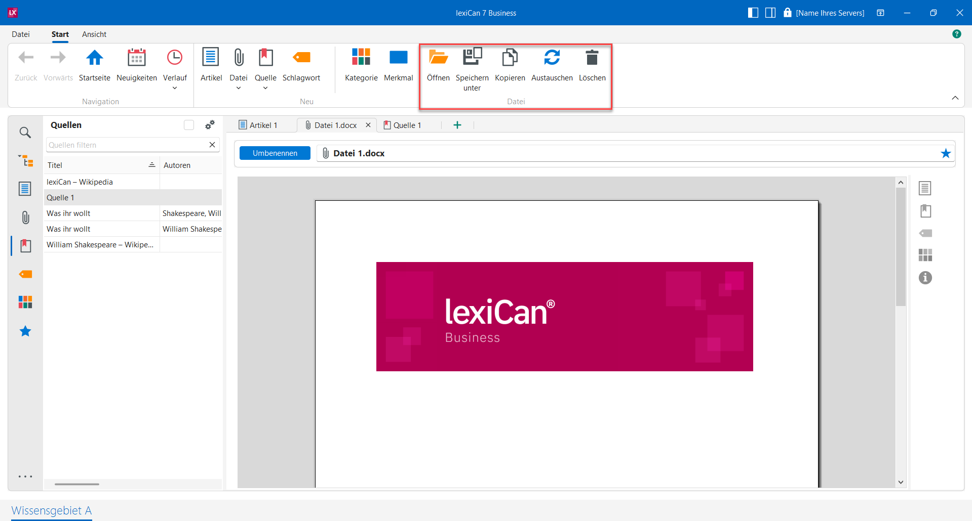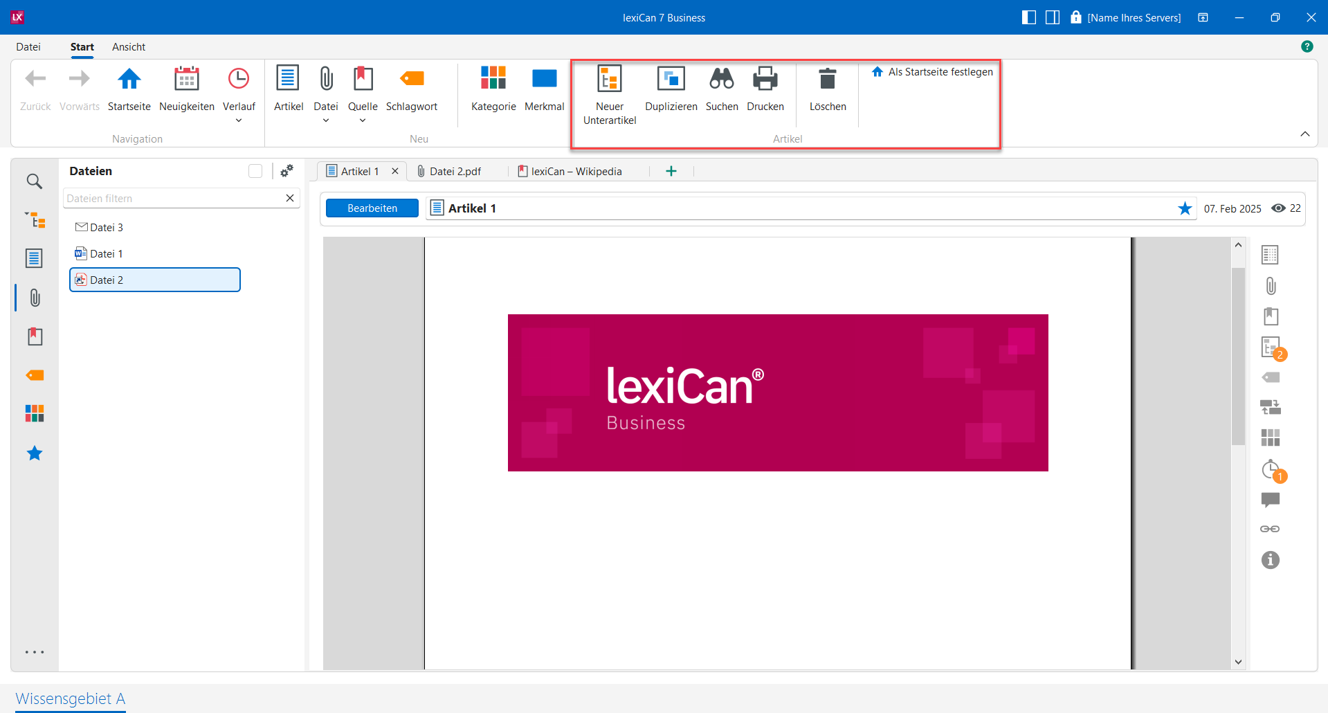 Beachten Sie, dass sich die Menüleiste "Start" an den jeweils angezeigten Inhalt, also Artikel, Quelle oder Datei anpasst (im Folgenden rot umrandet).