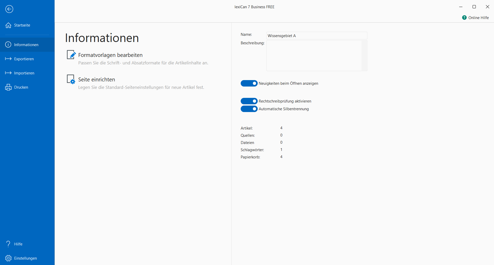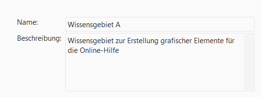 Rechts davon sehen Sie den Namen und die optionale Beschreibung des geöffneten Wissensgebiets, z.B.