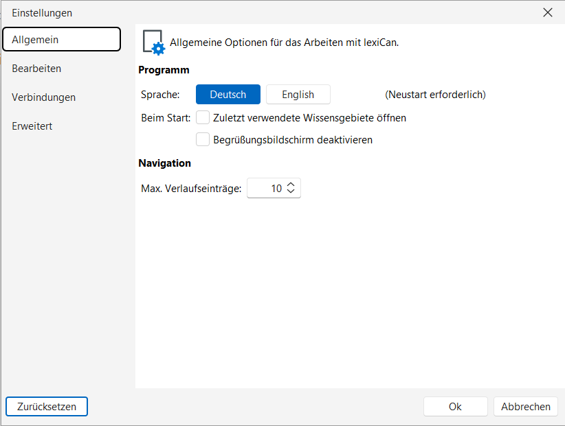 Hier finden Sie zentrale Einstellungsmöglichkeiten für und Informationen über das jeweilige Wissensgebiet.