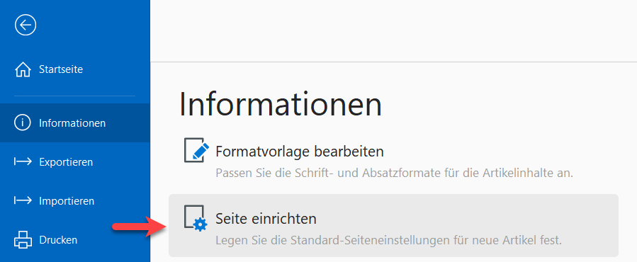 Über "Seite einrichten" könne Sie die Vorlage für neue Artikel eines Wissensgebiets modifizieren. Lesen Sie hierzu auch Artikel formatieren/"Seite einrichten".