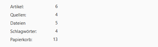 Der Bereich unterhalb ist selbsterklärend und listet auf, wie viele Artikel, Dateien, Quellen etc. das jeweilige Wissensgebiet enthält, z.B.