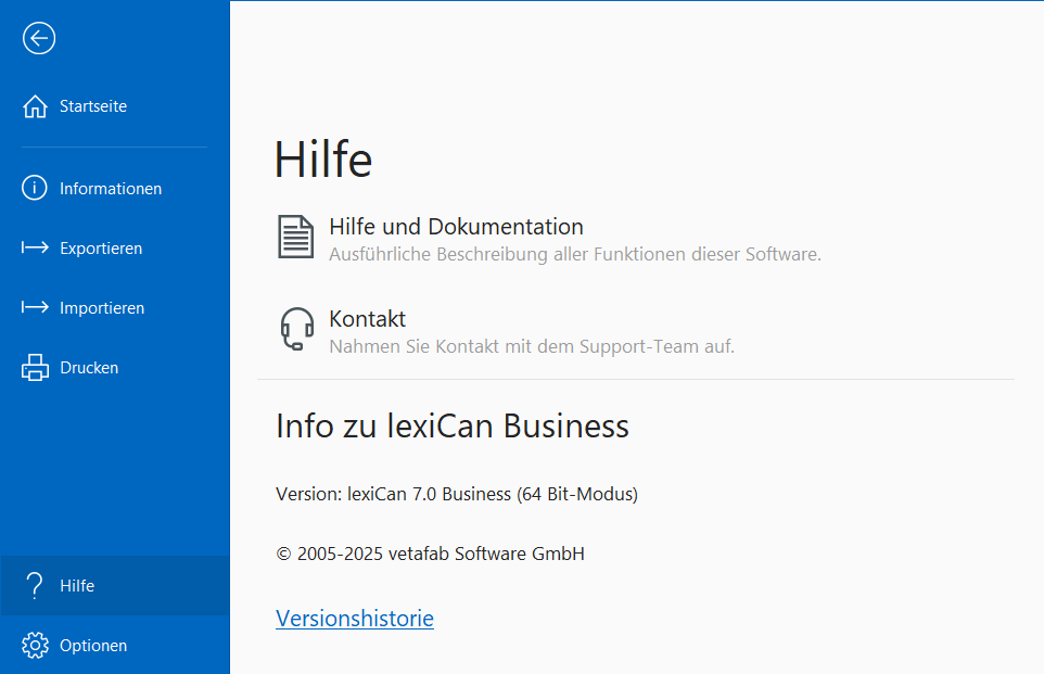 In diesem Abschnitt finden Sie Informationen zur Programmversion und die Versionshistorie. Außerdem können Sie diese Dokumentation und das Kontaktformular unserer Webseite öffnen, um im Bedarfsfall mit dem Support-Team Kontakt aufzunehmen.