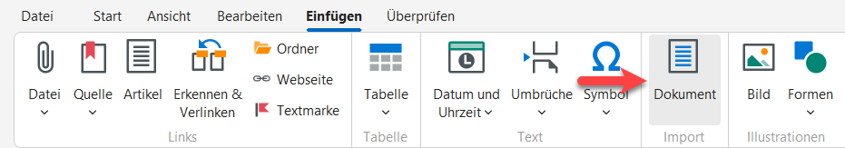 Setzen Sie dann den Cursor an diejenige Stelle im Inhaltsbereich, an welcher die Inhalte eingefügt werden sollen. Anschließend klicken Sie in der Menüleiste "Einfügen" auf "Dokument".