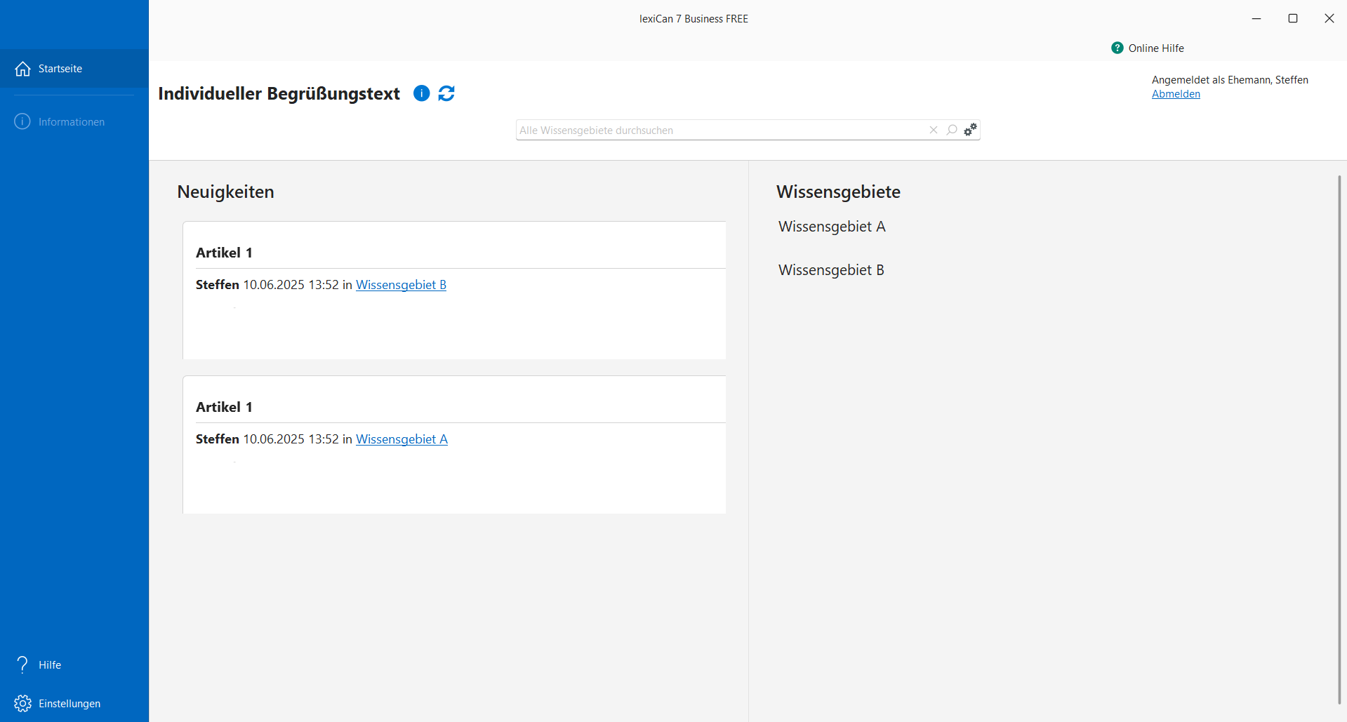 Sie können beliebig viele Wissensgebiete zu unterschiedlichsten Themen erzeugen mit beliebig vielen Artikeln, Dateien und Quellen. Es gibt Anwenderinnen und Anwender, deren Wissensgebiete viele tausend Artikel beinhalten und Datenmengen von mehreren GB umfassen.