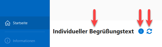Links oben sehen Sie den individuell vom Systemadministrator zu definierenden Begrüßungstext. Über den Button rechts daneben (Info) finden Sie technische Informationen zum Serverrechner. Eine Aktualisierung der Seite ist über den zweiten Button möglich
