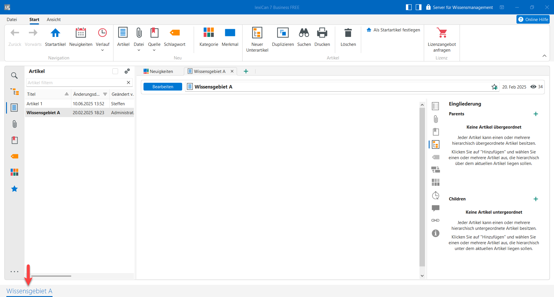 Ein Wissensgebiet schließen Sie in der Tab-Leiste mittels Kontextmenü (rechte Maustaste)