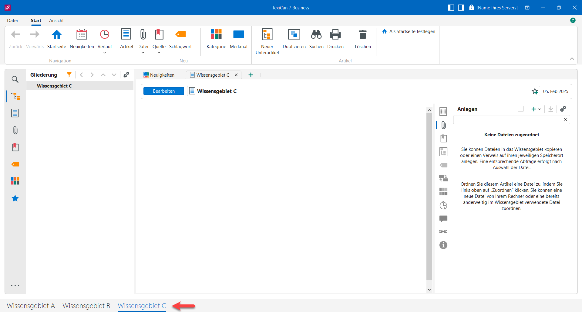 Wissensgebiete in lexiCan Business werden mit Hilfe des lexiCan Administrator zentral erstellt und verwaltet. Die für die Verwaltung des Systems zuständige Person legt dort auch fest, auf welche Wissensgebiete Sie Zugriff haben. Je nach Systemeinstellung benötigen Sie sogar ein Benutzerkonto mit Passwort zur Autorisierung. Wenden Sie sich bei diesbezüglichen Fragen an die zuständige Person oder Ihren IT-Support.