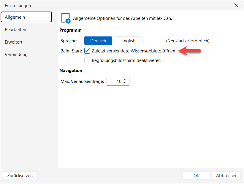 Über die individuellen Programmeinstellungen können Sie bestimmen, dass lexiCan nach dem Programmstart automatisch das oder die zuletzt genutzten Wissensgebiete öffnet. Das macht zumindest dann Sinn, wenn Sie nur ein Wissensgebiet verwenden.