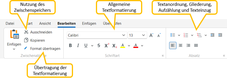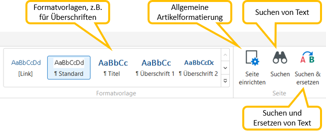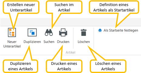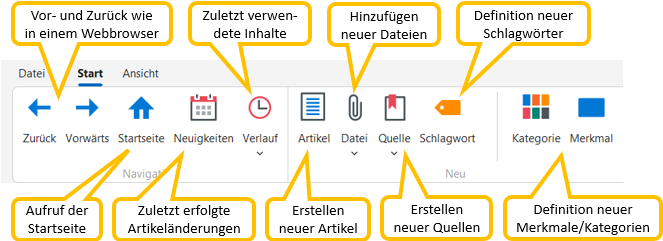 Die Menüleiste "Start" ist die wichtigste. Der vordere Bereich bei allen Inhalten (Artikel, Dateien, Quellen) gleich.