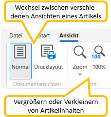 Die Menüleiste "Ansicht dient der optischen Anpassung der Artikeldarstellung.