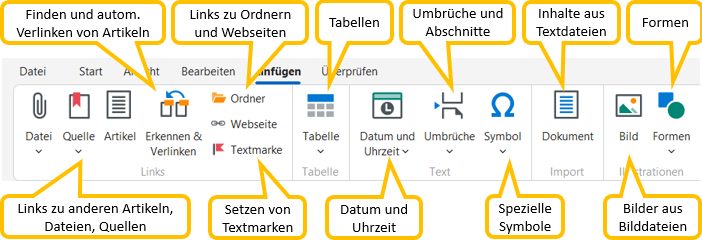 Auch die Menüleiste "Einfügen" wird erst sichtbar, wenn Artikel neu erstellt oder in Bearbeitung genommen wird. Sie stellt verschiedene Möglichkeiten zum Einfügen von Inhalten in einen Artikel zur Verfügung.