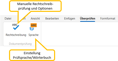 Mit Hilfe der Menüleiste "Überprüfen" können während der Bearbeitung eines Artikels manuelle Rechtschreibprüfungen durchgeführt werden und die hierfür zugrundeliegende Sprache absatzgenau definiert werden.