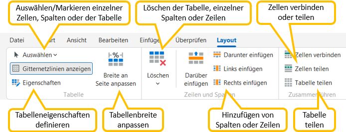 Die Menüleiste "Tabelle" steht nur zur Verfügung, wenn sich der Cursor in einer Tabelle befindet oder Teile einer Tabelle ausgewählt sind.