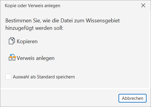Die Entscheidung an dieser Stelle hängt von der jeweiligen Situation ab. Sollte eine Datei häufigen Änderungen unterworfen sein, empfiehlt es sich, lediglich auf sie zu verweisen ("Verweis anlegen"), da Änderungen problemlos gespeichert werden können. Möchten Sie Ihr Wissensgebiet dagegen mit sich führen, z.B. auf einem externen Datenträger, kommt nur eine Kopie der Datei in Frage. Weitere Hinweise: