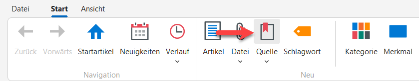 An erster Stelle steht die Menüleiste "Start". Klicken Sie dort auf Quelle.