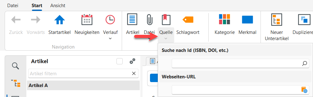 Das Einfügen mit direkter Verknüpfung mit einem Artikel oder einer Quelle erfolgt über den jeweiligen Kontextbereich.