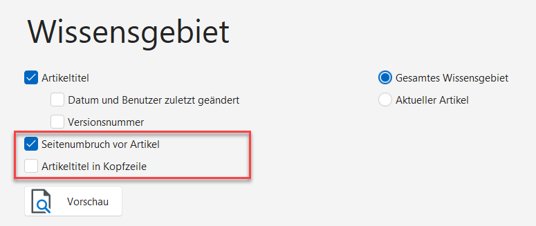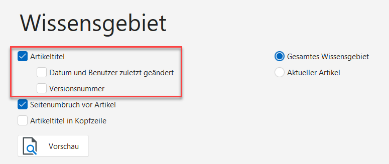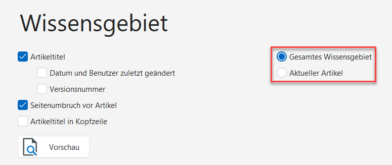 Beim Drucken von Artikeln stehen Ihnen verschieden Optionen zur Verfügung. Sie können alle Artikel drucken ("Gesamtes Wissensgebiet") oder nur den aktuell aufgerufenen Artikel.