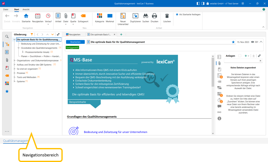 Der Navigationsbereich findet sich am linken Bildschirmrand und führt in verschiedenen Teilbereichen alle wichtigen Inhalte, insbesondere die Artikel eines Wissensgebiets auf.