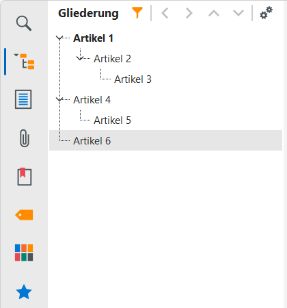 Die Gliederung ist Teil des Navigationsbereichs auf der linken Seite der Programmoberfläche. Beispielhafte Gliederung:
