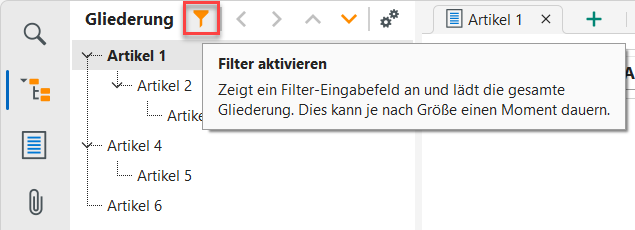 Der Anzeige des Filterfelds gehen das Laden und Erweitern der gesamten Gliederung voraus, was bei sehr großen Wissensgebieten etwas Zeit in Anspruch nehmen kann.