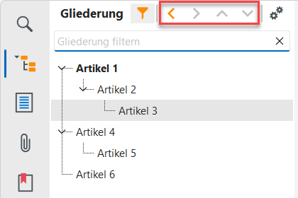 Mit Hilfe der kleinen Pfeile können Sie die Position/Einordnung eines Artikels in der Gliederung ändern. Dies ist aber auch per Drag'n Drop möglich, lesen Sie hierzu in Artikel einander unter- und überordnen.