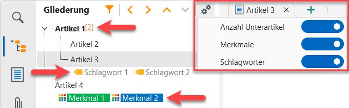 Über das Zahnrad-Symbol ganz rechts können Sie die Zahl der Unterartikel und die einem Artikel zugeordneten Merkmale und Schlagwörter zusätzlich zur Artikelbezeichnung anzeigen lassen, z.B.