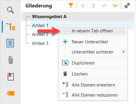 Der Startartikel (Artikel, der nach dem Öffnen des Wissensgebiets automatisch angezeigt wird) wird durch die stärkere Schrift hervorgehoben.