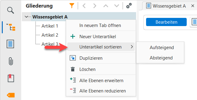 Sie können die einem Artikel untergeordneten Artikel sortieren (Reihenfolge: Sonderzeichen, Zahlen, Buchstaben).