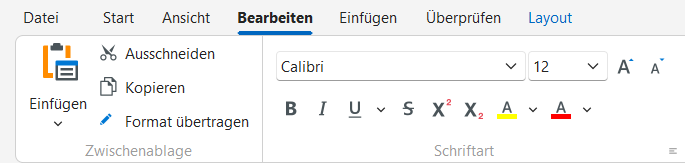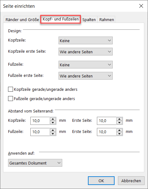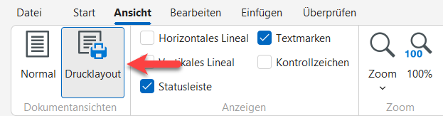 Hinweis zu Kopf- und Fußzeilen: Leere Kopf- und/oder Fußzeilen werden nicht, wie z.B. von MS Word bekannt angezeigt. Um die Zeilen sichtbar zu machen und füllen zu können, müssen Sie zunächst über die Menüleiste "Ansicht" das Drucklayout wählen.