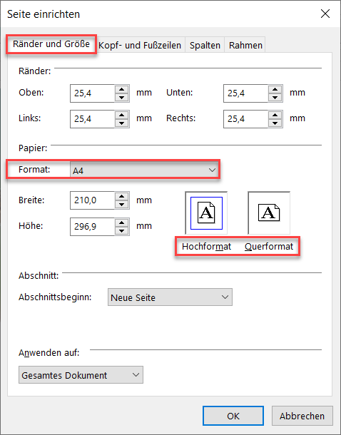 Nehmen Sie den Artikel zunächst in Bearbeitung, und klicken Sie dann in der Menüleiste "Bearbeiten" auf "Seite einrichten".