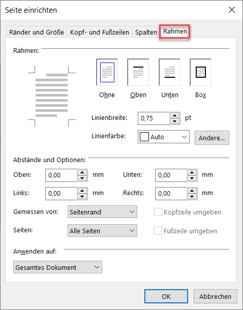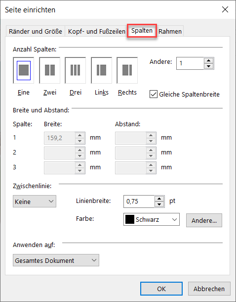 Über das Dialogfenster stehen Ihnen nun umfangreiche Möglichkeiten zur Formatierung des Artikels zur Verfügung. Sie können Größe und Ausrichtung des Artikels/der Seite, z.B. DIN A4 im Hochformat und Ränder bestimmen, Kopf- und Fußzeilen aktivieren, einen Artikel in Spalten unterteilen sowie Rahmen definieren.