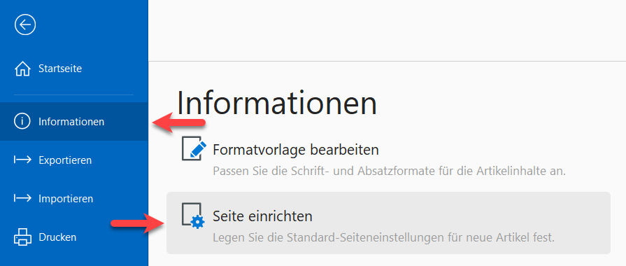 Wechseln Sie in das Hauptmenü, wählen Sie dort den Bereich "Informationen" und dann "Seite einrichten"