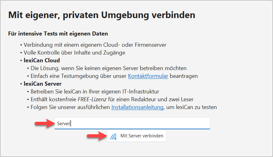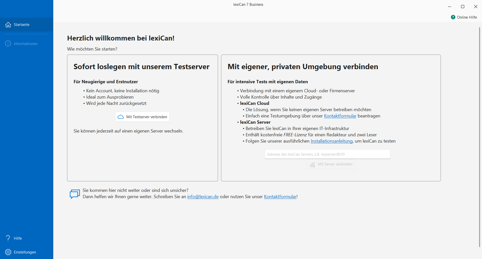 lexiCan Business ist eine Client-Server-Anwendung. Das bedeutet, dass in einem ersten Schritt eine Verbindung zwischen der Clientsoftware und der Serverinstanz von lexiCan hergestellt werden muss.