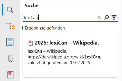 lexiCan besitzt eine Suchfunktion, über die ein Wissensgebiet nach bestimmten Zeichenketten (Wörter, Zahlen etc.) durchsucht werden kann. Im Navigationsbereich "Suche" erfolgt die Eingabe des Suchbegriffs/der Suchbegriffe und die Anzeige der Ergebnisse, z.B.