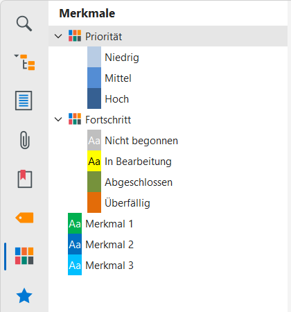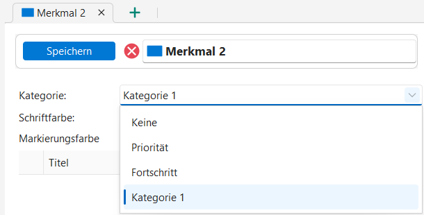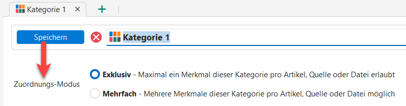 Merkmale müssen nicht zwingend Kategorien zugeordnet sein. Für Merkmale können Hintergrund- und Schriftfarbe definiert werden. Kategorien besitzen eine andere wichtige Einstellung - den sogenannten Zuordnungsmodus.