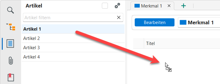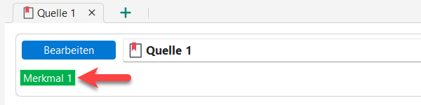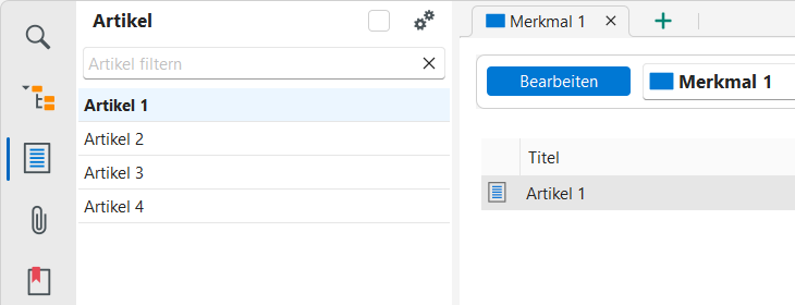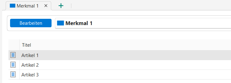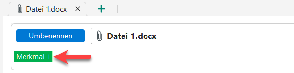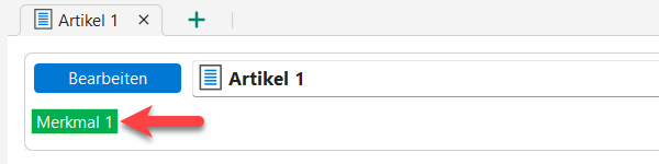 Zugeordnete Merkmale werden im Bereich des Namens/der Bezeichnung von Artikeln, Dateien und Quellen angezeigt, z.B.