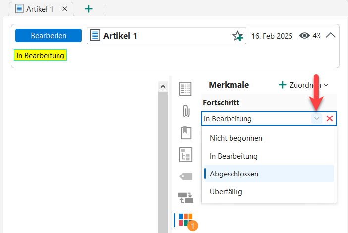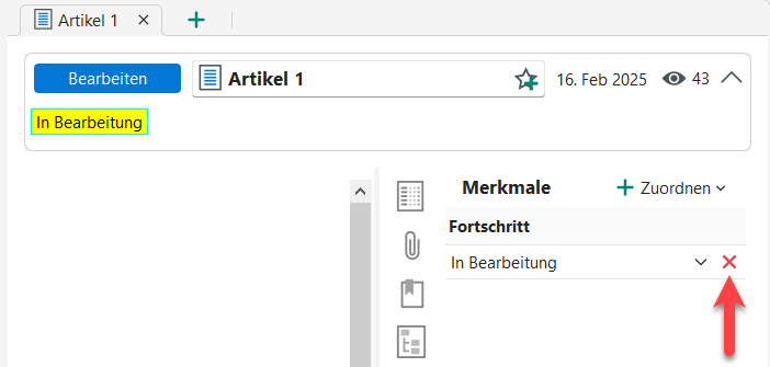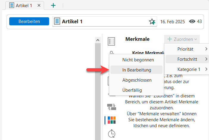 Rufen Sie den Artikel, die Datei oder Quelle über die Navigation auf, wechseln Sie rechts im Kontextbereich zum Unterbereich "Merkmale" und klicken Sie auf das Pluszeichen, um über das Pull-down Menü ein Merkmal auszuwählen, z.B.