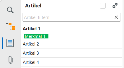 Optional werden Merkmale von Artikeln in der Navigation angezeigt, um z.B. den Bearbeitungsstatus eines Artikels zu verdeutlichen. Die Aktivierung der Anzeige erfolgt über das Zahnradsymbol.
