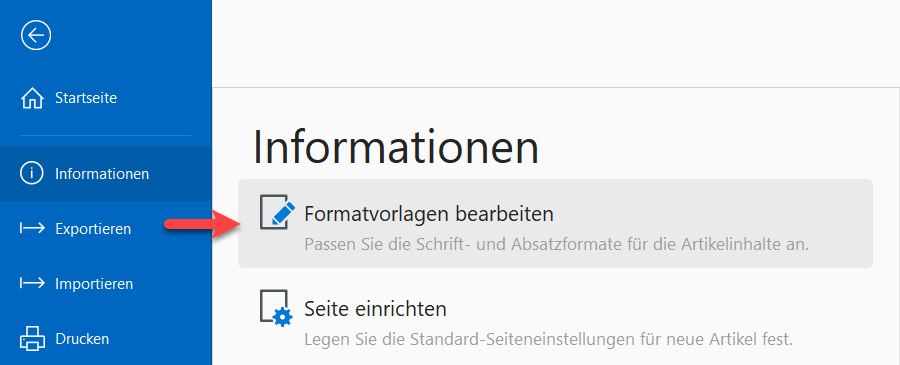 Um lexiCan in die Lage zu versetzen das Inhaltsverzeichnis zu erstellen, müssen Sie für die für Überschriften verwendeten Formatvorlagen Gliederungsebenen definieren. Zum Verwalten der Formatvorlagen eines Wissensgebiets öffnen Sie das Hauptmenü und "Informationen" und klicken dort auf "Formatvorlage bearbeiten".