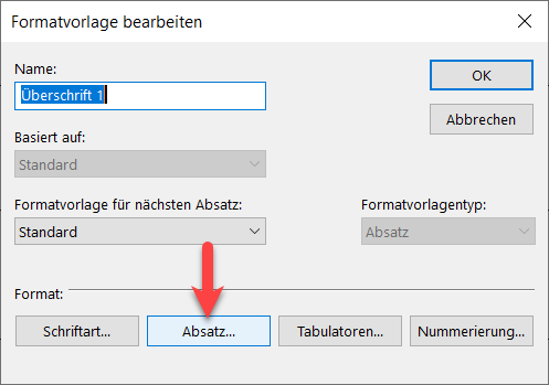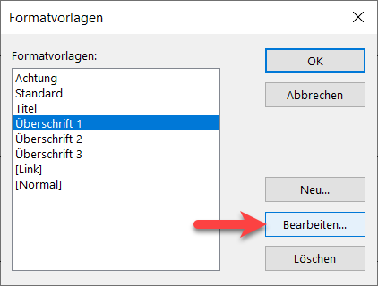 Wählen Sie nun eine Formatvorlage, z.B. "Überschrift 1" und klicken Sie auf "Bearbeiten".