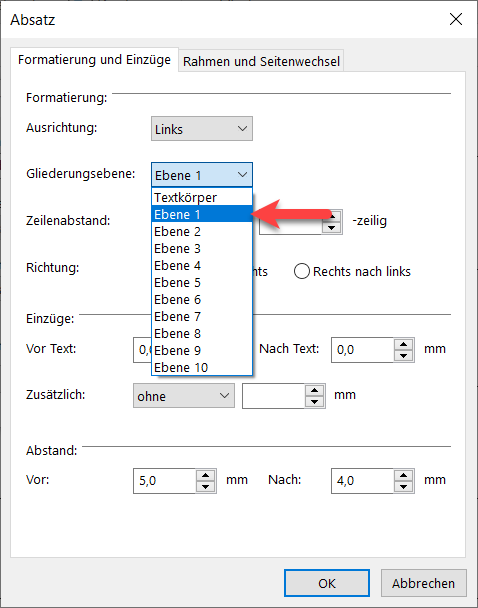 Unter "Formatierung und Einzüge" finden Sie das Feld "Gliederungsebene". Wählen Sie hier die Ebene, die für diese Formatvorlage im Inhaltsverzeichnis verwendet werden soll, z.B. "Ebene 1".