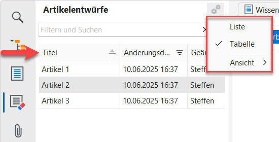 Über das Zahnrad-Symbol können Sie die Ansicht der Liste ändern. "Liste" zeigt nur die Artikelbezeichnungen an. Bei Auswahl von "Tabelle" werden zusätzliche Spalten eingeblendet, die z.B. das letzte Änderungsdatum eines Artikels anzeigen.