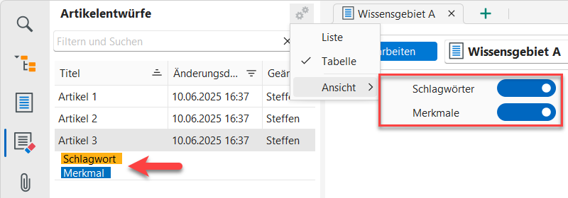 Über "Ansicht" lassen sich zusätzlich die einem Artikel zugeordnete Merkmale und Schlagwörter anzeigen, z.B.