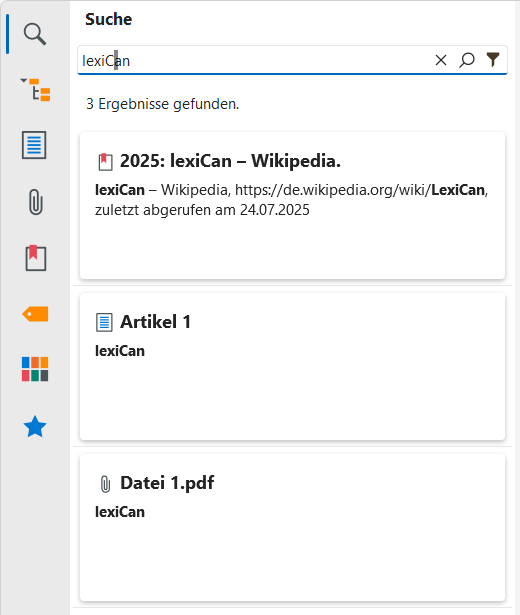 Geben Sie hier Ihren Suchbegriff (mehrere Suchbegriffe durch eine Leerstelle trennen) ein und klicken Sie auf das Lupensymbol oder drücken Sie die Eingabetaste. Die Funktion bietet auch eine Verlaufsanzeige zur Auswahl bereits in der Vergangenheit gesuchter Begriffe. lexiCan startet dann einen Suchlauf und zeigt schließlich alle Artikel, Dateien und Quellen an, welche den oder die Suchbegriffe beinhalten, z.B.