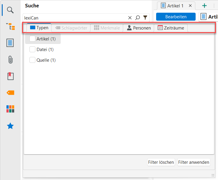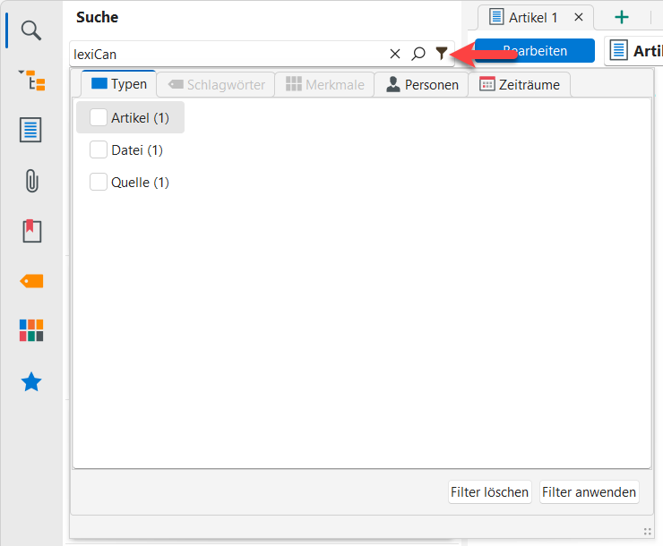 Sobald ein Wissensgebiet eine gewisse Größe erreicht hat, kann es sein, dass ein Suchvorgang sehr viele und bisweilen auch zu viele Ergebnisse liefert, um wirklich hilfreich zu sein. Wenn dann eine Einschränkung durch die Verwendung mehrerer Suchbegriffe nicht möglich ist, kann vielleicht die Filterfunktion von Nutzen sein und die Zahl der "Treffer" reduzieren helfen. Die möglichen Filter sind abhängig von den Suchergebnissen und können über den kleinen Filter-Button eingeblendet werden.