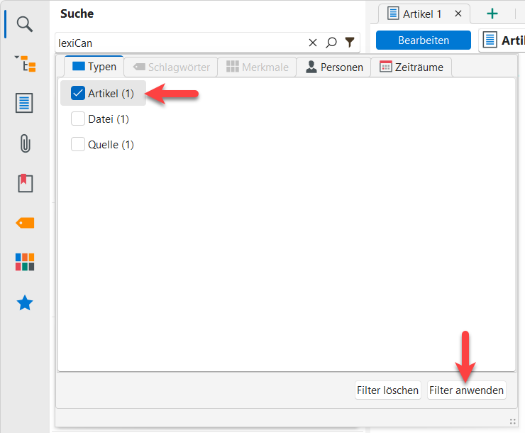 Anschließend werden nur solche Suchergebnisse angezeigt, die dem Filter entsprechen. In unserem Beispiel nur noch Artikel.