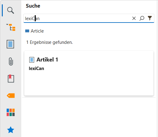 lexiCan verfügt über eine leistungsfähige Volltextsuche. Über diese Suchfunktion können Sie sämtliche textbasierten Inhalte eines Wissensgebiets auffinden - in Artikel, Dateien und Quellen. Sobald Sie einen neuen Textinhalt in lexiCan speichern, wird der Suchindex um diese Eingabe ergänzt. Dies gilt grundsätzlich auch für Textinhalte von Dateien.