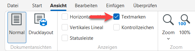 Stellen Sie für die nachfolgenden Erläuterungen sicher, dass lexiCan Textmarken anzeigt. Hierzu muss ein Artikel im Bearbeitungsmodus sein.