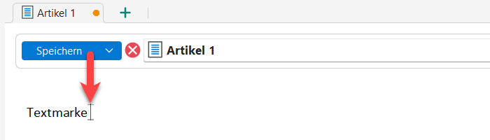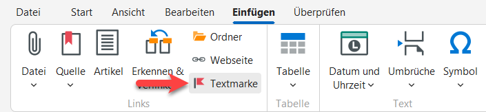 Bevor ein Link auf eine exakte Stelle innerhalb eines Artikels gesetzt werden kann, muss eben diese Stelle zunächst definiert und "markiert" werden. Wählen Sie dazu den Artikel mit der (Text-)Stelle aus, nehmen Sie ihn in Bearbeitung und setzen Sie den Cursor an die entsprechende Position. Klicken Sie anschließend in der Menüleiste "Einfügen" auf "Textmarke".