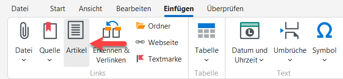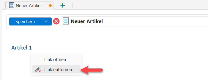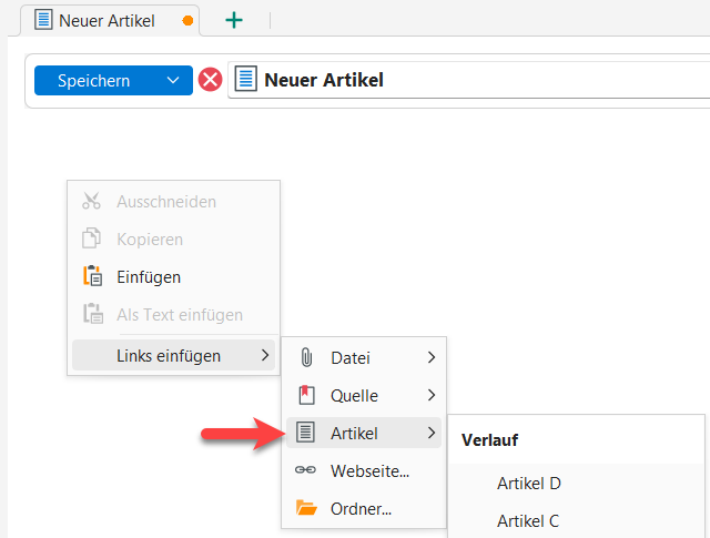 Nehmen Sie den betreffenden Artikel in Bearbeitung. Setzen Sie den Cursor an die Stelle, an welcher der Link erscheinen soll, oder markieren Sie bestehenden Text für den Link. Klicken Sie dann in der Menüleiste "Einfügen" auf "Artikel".